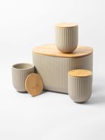 Elevate your kitchen with the thoughtfully designed Haden Ribbed Bread Bin. Perfect for storing bread and other items, the ceramic body with ribbed detail in a neutral putty shade fits seamlessly into your decor, and perfectly complements the Haden range of kitchen appliances in the same colour. The natural acacia wood lid fits snugly on top to keep contents fresher for longer.