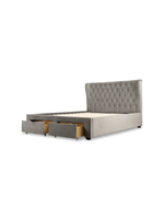 The Harmony Bed in LuxGuard Velvet combines ultra-comfortable sleep with practical bedroom storage. A diamond-tufted headboard with a subtle curved wing and a fully upholstered base brings a timeless elegance to the room. Two smooth pull drawers seamlessly integrated into the base are ideal for storing extra linen or blankets.