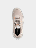 The Hi-Tec Womens Tempest Simply Taupe Trail Running Shoes shoe features a durable synthetic and mesh upper for lasting wear. It includes rugged reinforced PU panels at the toe and heel to enhance protection. A padded collar and tongue provide added ankle support and comfort. The moisture-wicking lining keeps feet dry.