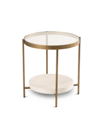 A marvellous piece for your living room, this elegant side table is made with tempered glass and finished with brass legs and a beautiful and contemporary concrete design detail. A showcase for your style.