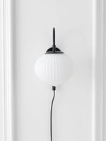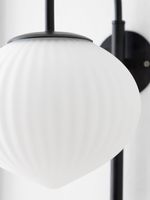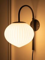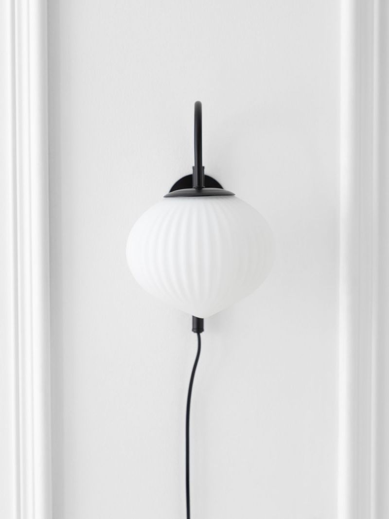 Update any room with the on-trend Japandi Wall Sconce. This sconce features a cord and switch, making it easy to install near an existing plug-point without the hassle of installing in-wall wiring like traditional sconces. An antique-style, Japanese-inspired frosted glass shade with fluted detail is suspended from a modern, matte black, curved metal arm, creating a contemporary look. Perfect for placing on either side of a bed or above seating in a living space, sconces provide soft, yet direct ambient light for a calm and cosy feel.