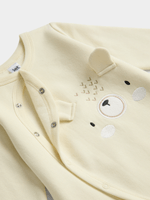 Get ready for cozy nights with our Jet Baby Cream Novelty Bear Ears Brushed Fleece Sleepsuit. Made with soft poly cotton, this sleepsuit features adorable bear ears for extra cuteness.