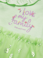 Introducing the Jet Baby Green Love My Family Tutu Bodyvest, perfect for stylish little ones. Made from soft cotton, this bodyvest features a cute tutu design and a sweet "Love My Family" print. Comfortable and adorable, it's a must-have for any baby's wardrobe.