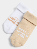 Introducing the Jet Baby Oatmeal Hello World 2Pk Towelling, perfect for keeping your little one cozy and dry. Made from soft cotton, these towels feature a cute "Hello World" design. The unisex set is ideal for gifting. Say hello to comfort and style with Jet.