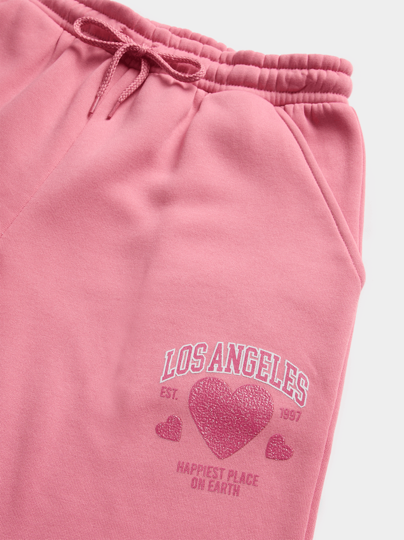 Introducing the Jet Younger Girls Pink Los Angeles Jogger for a comfy and stylish look. Made from soft fleece material for all-day comfort. Features a vibrant geranium pink color with a sweet kindness print.