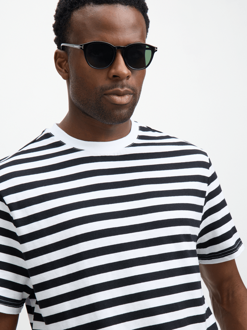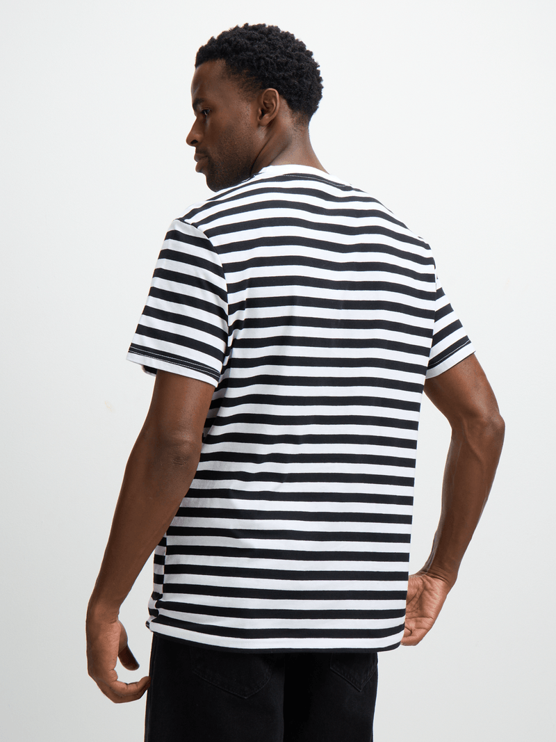 Introducing the Jet Black and White Stripe T-Shirt, a versatile wardrobe essential crafted from soft single jersey material. This classic tee boasts timeless style with its stylish stripe design.
