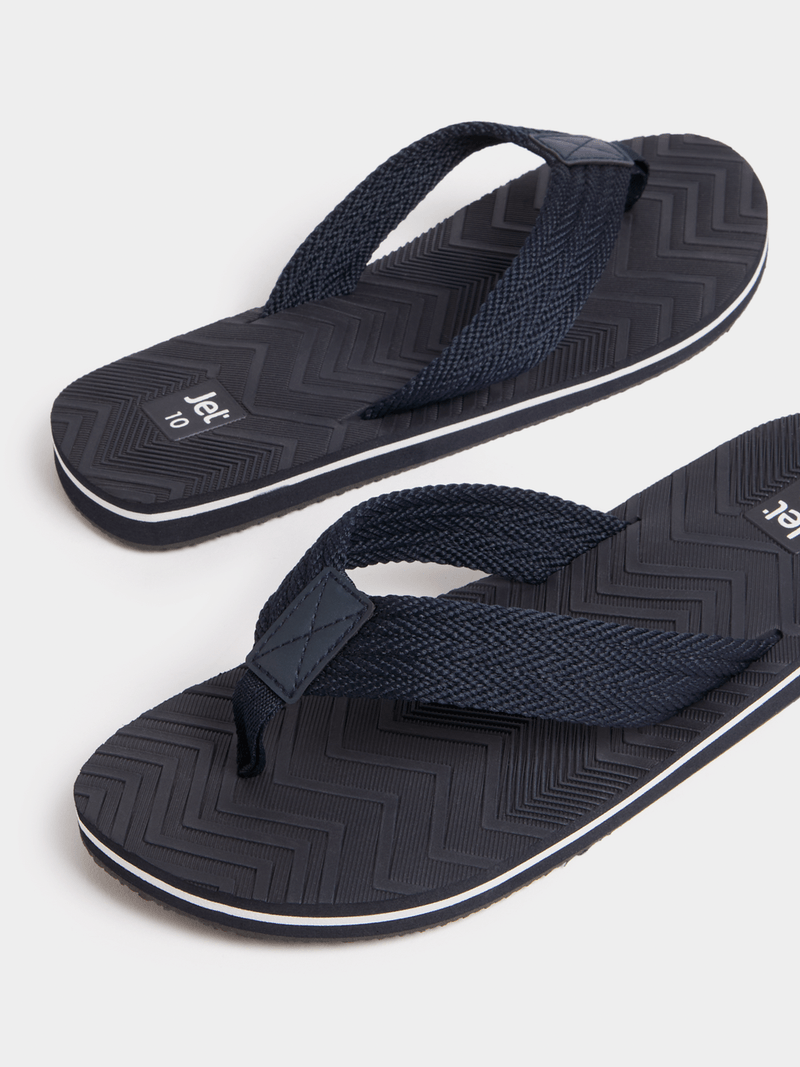 Step into summer with Jet Men's Navy Webbing Flip Flops. These sleek and comfortable sandals are perfect for all your warm-weather adventures. Featuring durable webbing straps and a cushioned footbed, these flip flops will keep you stylish and comfy all day long.