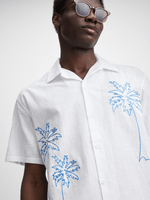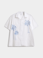 Introducing the Jet White/Blue Palm Trees Shirt! This stylish shirt features a fun palm tree print on a crisp white background. Made for comfort with a relaxed fit, it's perfect for casual outings or beach days. Easy to style and easy to love. Stand out in style with this must-have shirt!