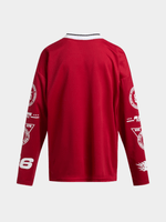 Introducing the Jet Older Boys Red Birdseye Long Sleeve Fashion T-shirt. Made from durable polyester, this stylish tee features a vibrant red color with a unique birdseye pattern.