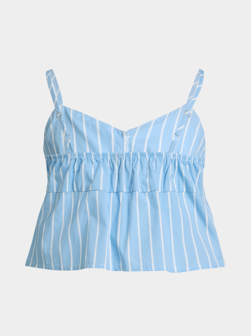 Introducing our effortlessly chic light blue stripe front tie top! Made from soft cotton for maximum comfort. Features a trendy front tie detail for a stylish twist.