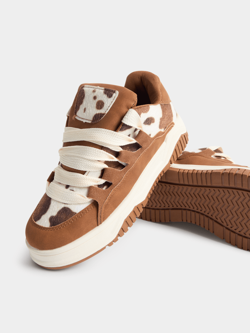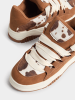 Introducing the Jet Teen Tan Cow Print Chunky Sneaker! Step up your shoe game with this stylish pair made of durable polyurethane.