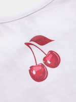 Meet your new favorite summer top! This trendy piece features a cute white cherries print and strappy design for a fun and stylish look. Made from comfortable cotton lycra, it's perfect for all-day wear. Enjoy the versatility and comfort of this top that's perfect for any occasion.