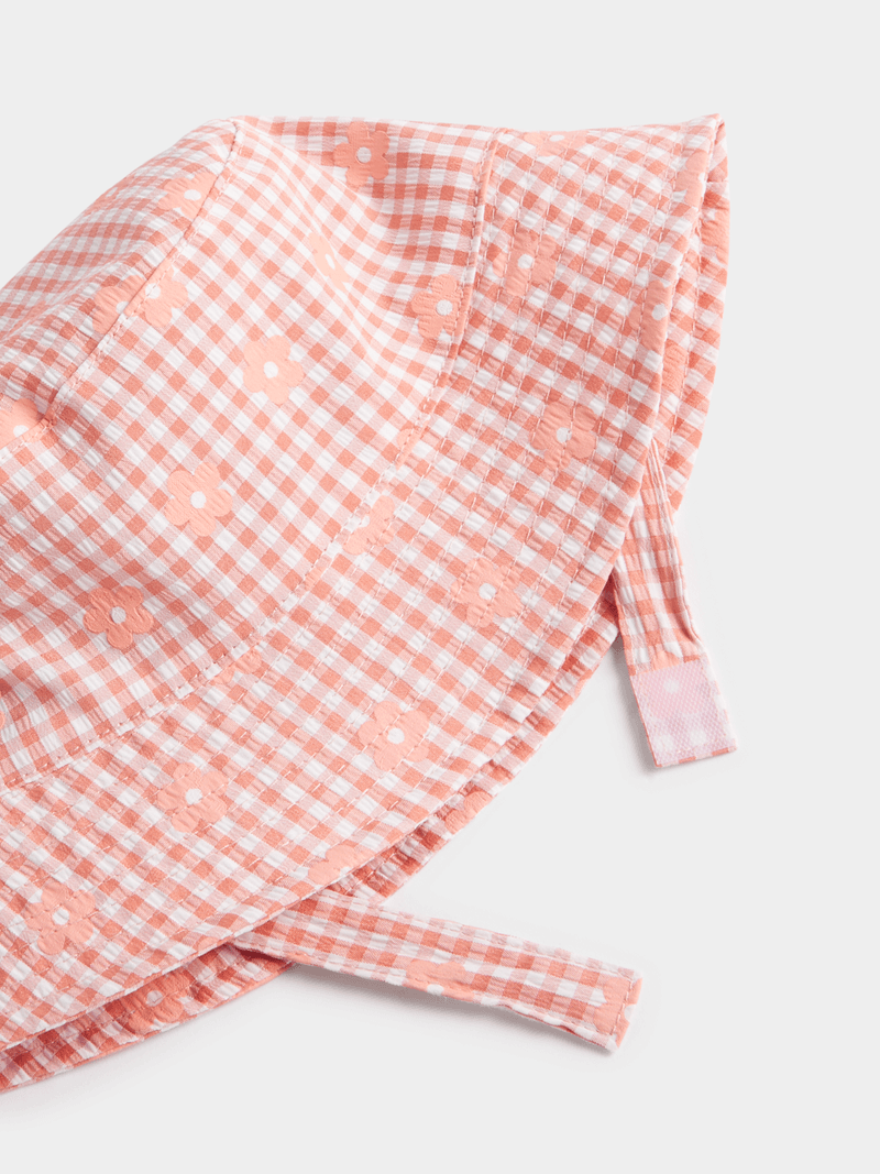 Stay stylish and sun-safe with the Jet toddler girls pink gingham cherry bucket hat. Made from a comfortable polyester blend, this hat is perfect for sunny days. Enjoy the adorable cherry print while keeping your little one protected.