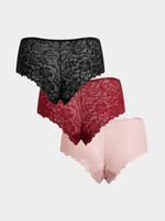 Indulge in ultimate comfort with our Jet Women's 3 Pack Blush Red Black Lace Bikini Leg Briefs. Made with soft and stretchy lace material for a perfect fit. These briefs are designed to keep you feeling confident and stylish all day long.