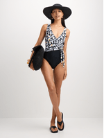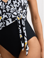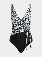 Turn heads at the beach with our Jet Women's Black and White Tie-Up One-Piece Swimsuit. The AOP top adds a stylish touch to this must-have swimwear. Made from high-quality nylon for comfort and durability. Perfect for a day of fun in the sun.