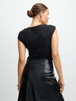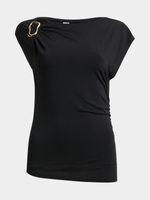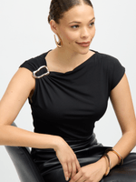 jet women's black buckle top is a versatile piece with a sleek design. Made with 95% polyester and 5% spandex for a comfortable fit. Features a stylish buckle detail that adds a touch of flair to any outfit.