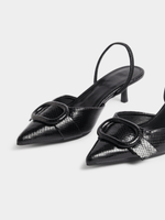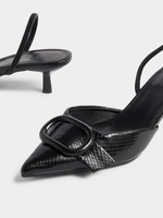 Step up your shoe game with our sleek Jet Black Croc Pointy Slingback Heels. These stylish heels feature a trendy croc texture, a flattering pointed toe, and a comfortable slingback strap. Perfect for any occasion, these heels are the versatile addition your wardrobe needs.