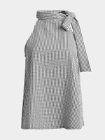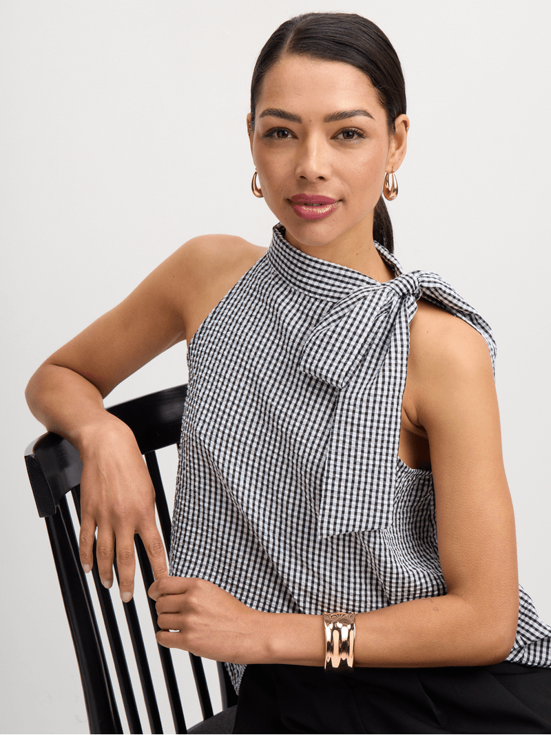 Add a touch of charm to your wardrobe with our Jet Black Gingham Bow Blouse. Made from 100% polyester, this versatile piece is perfect for any occasion.