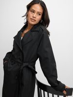 Stay sleek and stylish in the Jet Black Trench Coat. Made from 100% Polyester Twill, this timeless piece is perfect for any occasion.