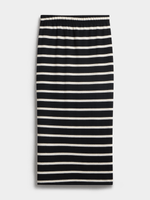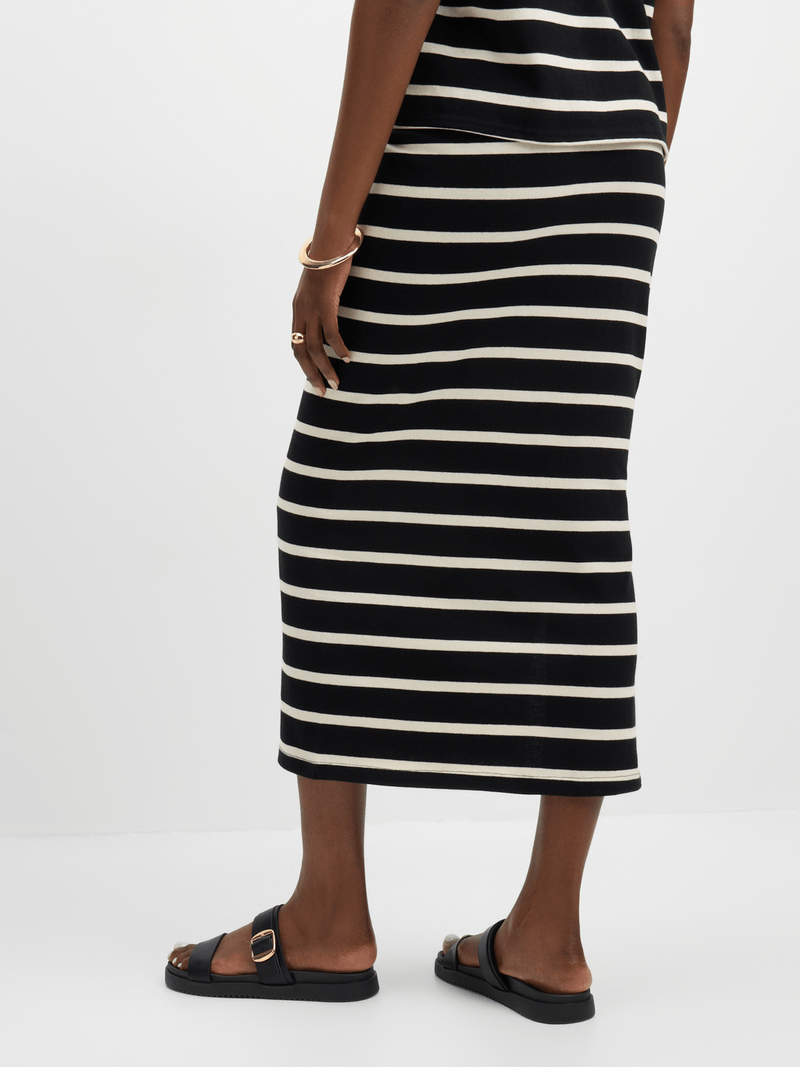 Elevate your style with Jet's black and white stripe knit maxi skirt. Made from 100% cotton for ultimate comfort. This versatile skirt is perfect for any occasion. Stay on-trend and feel confident in this chic and timeless piece. Add it to your wardrobe today!