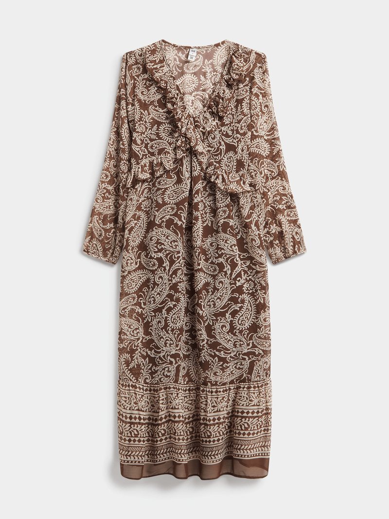 Introducing the Jet Brown Paisley Frill Maxi Print Dress, crafted from 100% polyester chiffon for a luxe feel. This dress features a stylish paisley print and feminine frill details, perfect for any occasion.