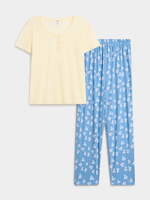 Lounge in style and comfort with our butter yellow & blue capri pyjama set. Made from a soft cotton blend, this set features a cozy top and matching bottoms. With a relaxed fit and cute design, it's perfect for a restful night's sleep or lazy days at home. Enjoy the ultimate relaxation in this must-have set.