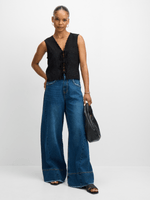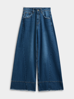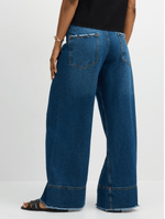 Introducing Jet's Women's Dark Wash Asymmetrical Wide Leg Denim! This stylish denim offers a unique asymmetrical design for a modern look.