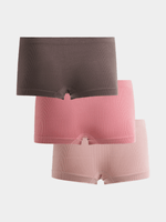 Introducing a versatile set of 3 pack seamless boy leg underwear that offers comfort and style all day long. Made with ribbed fabric in a chic nude, mocca, and rose color combo. Features seamless construction for a smooth fit under any outfit.