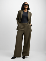 Elevate your style with our Jet Olive Front Crease Wide Leg Trouser. Made from a luxurious polyester blend with a touch of spandex for stretch.