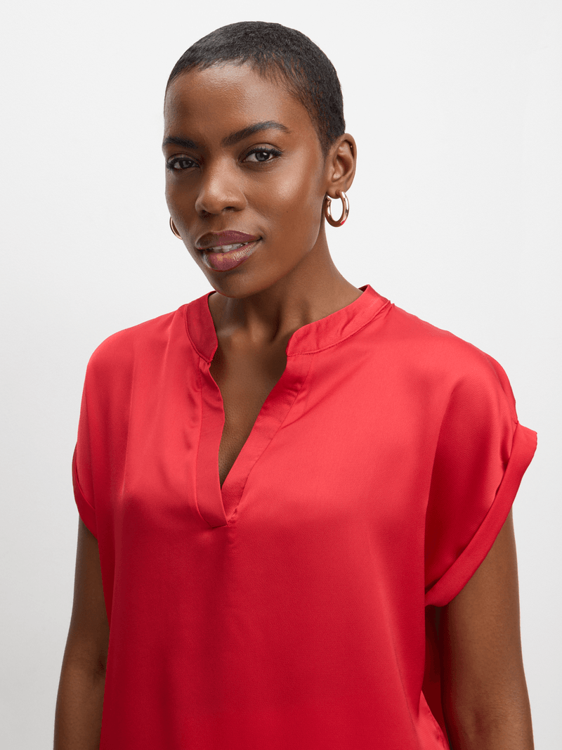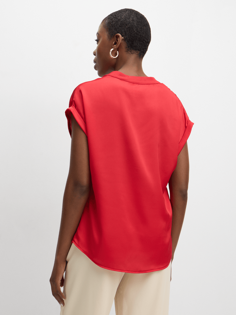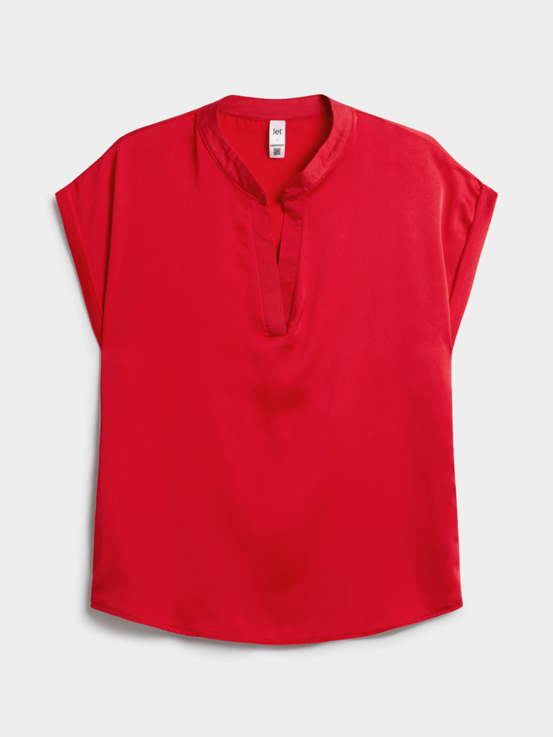 Elevate your look with our Jet Red Satin Shell Top. Made from 100% polyester, this vibrant top adds a touch of luxury to any outfit.
