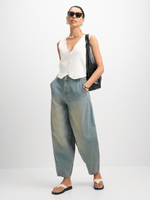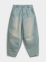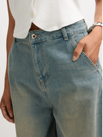 Introducing Jet Women's Stained Blue Barrel Denim Pants for a stylish and comfortable look. Made with a blend of 75% cotton, 10% polyester, and 15% viscose for durability and softness.