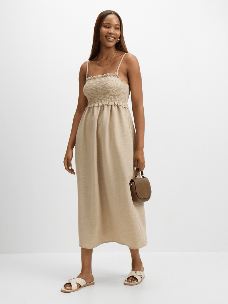 Elevate your summer wardrobe with our Jet Stone Smocked Strappy Maxi Dress. Made from a luxurious linen blend, this dress is perfect for any occasion.