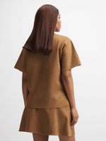 Introducing Jet's Women's Tan Suede T-Shirt, made with a luxurious blend of 95% polyester and 5% spandex for a comfortable and stylish fit. This non-kids, non-furniture item is returnable and perfect for everyday wear. Upgrade your wardrobe with this chic suede material top.