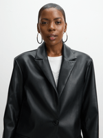 Jet black PU blazer exudes sophistication and style. Crafted from a blend of 40% polyurethane and 60% polyester. This chic blazer is perfect for any occasion.