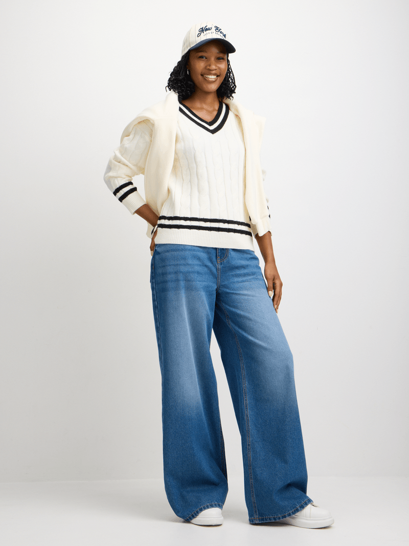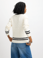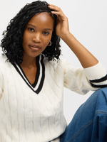 Stay cozy in style with our Jet cream V-neck cable pullover. Made with a luxurious blend of 90% polyester and 10% spandex, this pullover is soft and stretchy for all-day comfort.
