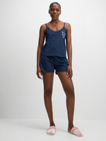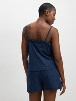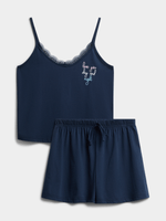 Indulge in luxury with our Jet Navy Lace Knit Pyjama Set. Made with soft poly-cotton blend fabric for ultimate comfort. The set includes a charming lace cami and matching shorts. Perfect for lounging or sleeping in style. Elevate your downtime with this elegant and cozy ensemble.