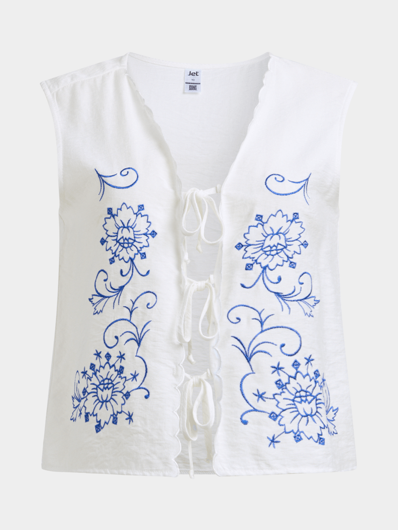 Stay chic with Jet's White Blue Scalloped Boho Vest. Made with 85% Rayon and 15% Nylon, this vest is a must-have addition to your wardrobe. With its scalloped design, it adds a touch of boho flair to any outfit.
