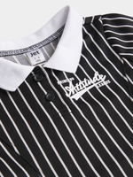 Introducing a playful black and white stripe dress from Jet's latest collection. Made with quality fabric for comfort and style. Featuring a birdseye pattern for a unique twist. Perfect for any young fashionista looking to stand out. Dress to impress with this trendy piece!