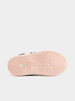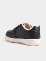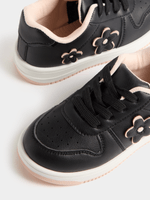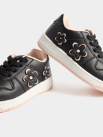 Elevate her style with the Jet Black Pink Flower Court Sneaker, designed for comfort and durability. These sneakers feature a sleek black design with pops of pink flowers for a fun touch.