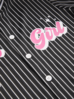 Introducing the Jet Black Stripe Button Down Top for young trendsetters. This stylish top features a classic button front and a playful black stripe birdseye design for a fun touch. Made for comfort and style, this top is a must-have addition to any wardrobe. Perfect for everyday wear or special occasions. Upgrade your little one's outfit with this versatile top!