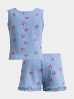 Get ready for bedtime with our Jet Younger Girls Blue Cherry Print Rib Short PJ Set! Made from a cozy cotton blend, this set is perfect for a comfortable night's sleep.