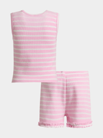 Upgrade her sleepwear with the Jet Younger Girls Pink And White Stripe Rib Short PJ Set. Made from a comfy cotton blend, this set features a stylish pink and white stripe design.