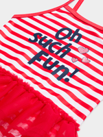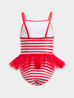 Let your little one make a splash in style with this adorable red stripe swimsuit featuring a playful tutu.