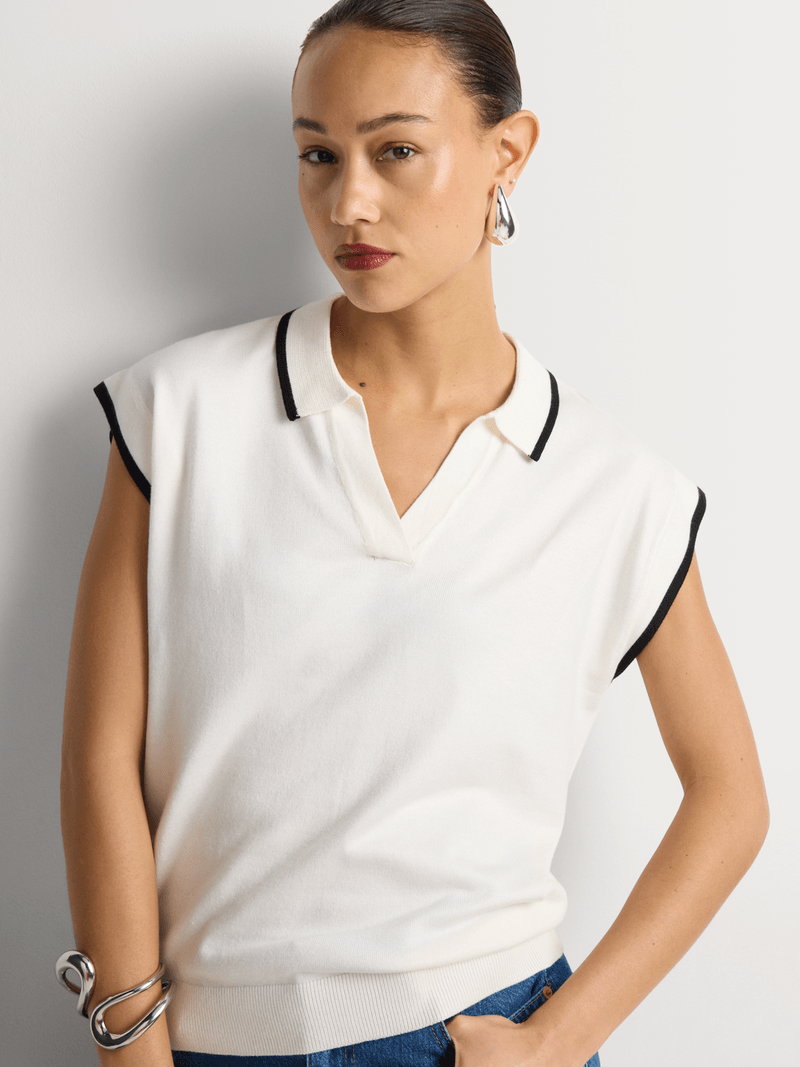 Knit tops are a must-have style this season. Wear our fine knit Johnny Collar Extended Shoulder Top with everything from denim to shorts, skirts and pants.