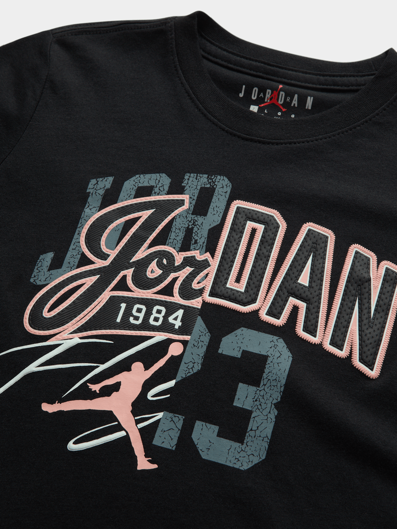 Introducing the Jordan Varsity Split T-Shirt, perfect for your little one's wardrobe. Made from a comfortable blend of cotton and polyester, this black tee is stylish and versatile. Let your child express their unique style with this must-have piece. Supplier style: 85F224-023