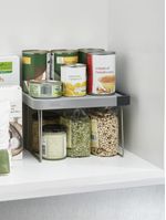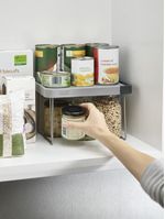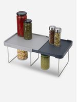 Joseph Joseph brings innovative ideas to the kitchen. Maximise your cupboard space in an instant with this smart storage shelf. It has wire legs that fold out and lock into place, creating a stable platform for storing jars, cans and packets with space underneath for more items. The shelf itself can be expanded from 25.5 cm (10 inches) up to 40.5 cm (16 inches) to fit available space and it has a textured surface and raised edges to stop items sliding off.