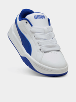 The Junior Puma Park Lifestyle Easy White/Blue Sneaker features a PU fabric for style and durability. Perfect for all-day comfort, this sneaker is designed for easy wear and a relaxed lifestyle. With a returnable feature and versatile design, it's a must-have for any wardrobe.