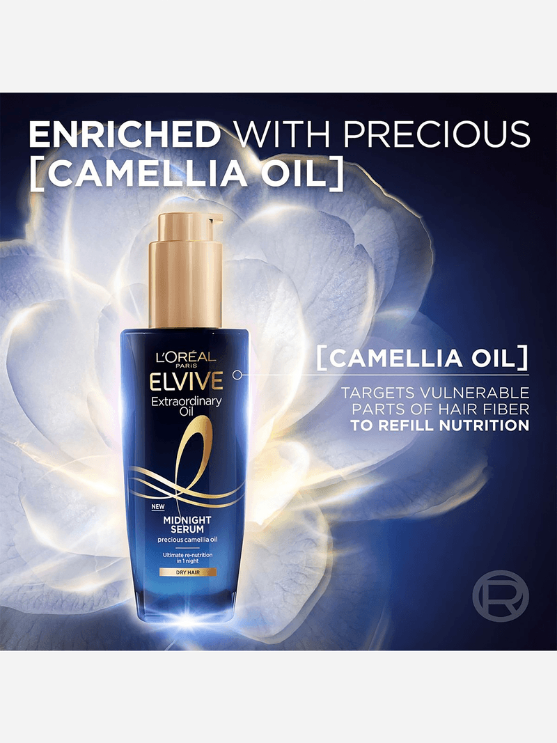 Indulge in a midnight hair ritual. L'Oral Paris Elvive Extraordinary Oil Midnight Serum envelops your hair in a veil of luxurious nourishment. Formulated with Camellia Oil, it penetrates deeply to repair and revitalize, revealing hair that's irresistibly soft, smooth, and radiant. Experience the extraordinary.