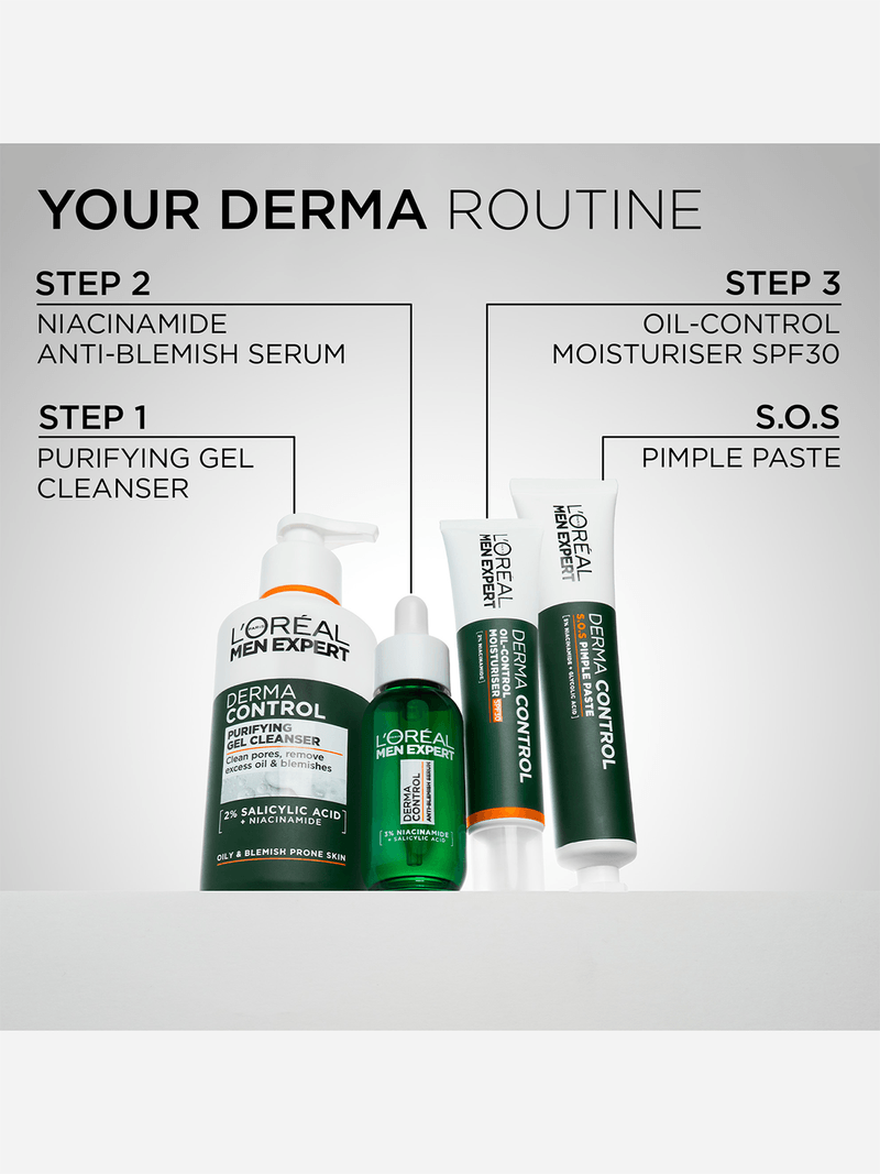 Take the control of your blemishes with the derma control 2in1 pimple paste specifically designed for men with oily & blemish-prone skin. Formulated with niacinamide and enriched with glycolic acid, it helps reduce the appearance of blemishes and imperfections overnight. Suitable for all skin types including sensitive skin.