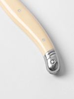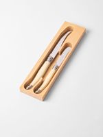 Made by master cutlers in France, every Laguiole tool has to go through 50 quality control steps to pass inspection. These tools are imbued with French passion and a deep love for food, and are made 100% in France. Designed with the signature bee on the handle, these are the real deal. Set includes one curved, two pronged knife for medium cheeses, and one blunt-nosed paddle knife for spreading soft cheeses